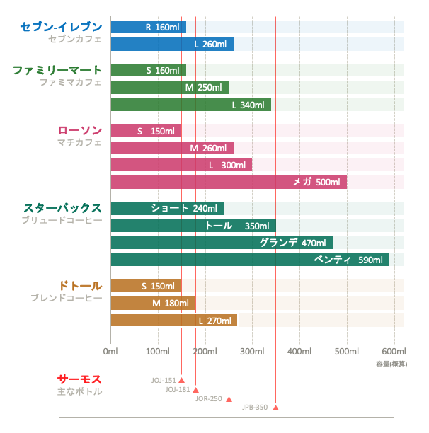 コンビニ大手やスターバックス、ドトールで買うコーヒーと、私がよく使うサーモスのマイボトルの容量を比較します。